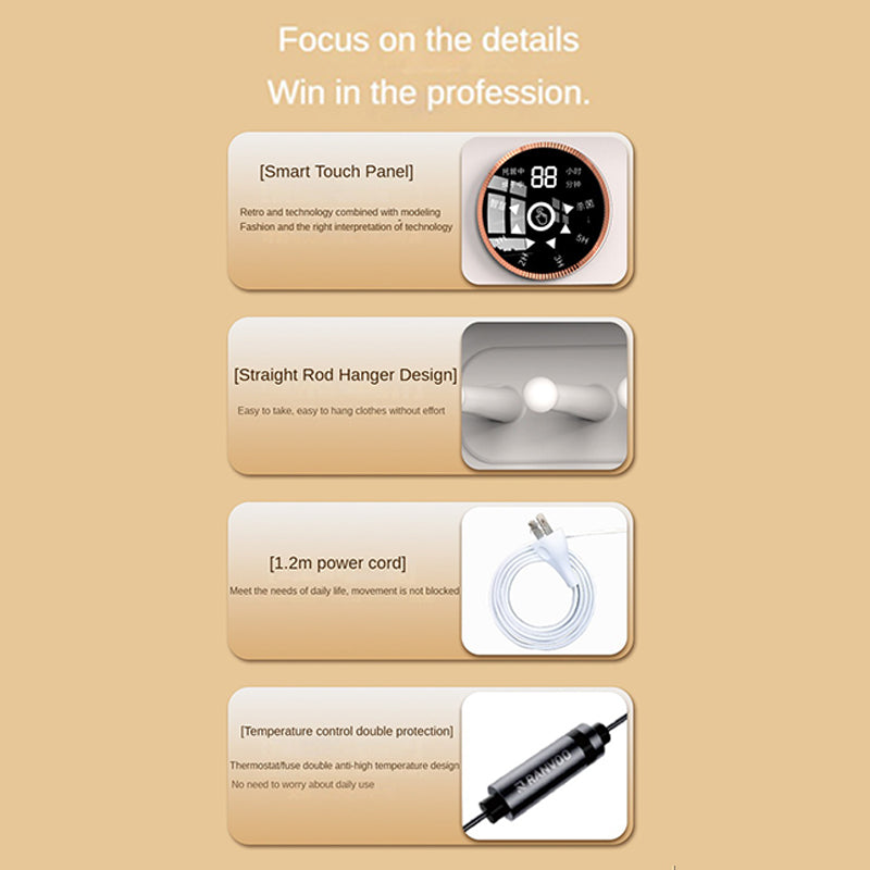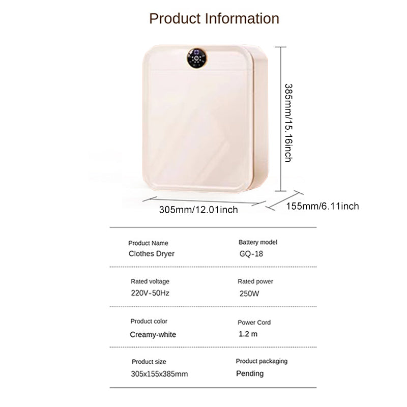 When I first saw this clothes dryer, its simple white appearance immediately caught my eye. The body is compact and delicate, not taking up much space, and it's suitable for placing in a corner of the house or on the balcony. The round display screen on the top has a simple design, and the operation buttons are clear at a glance. The overall design is both beautiful and practical.