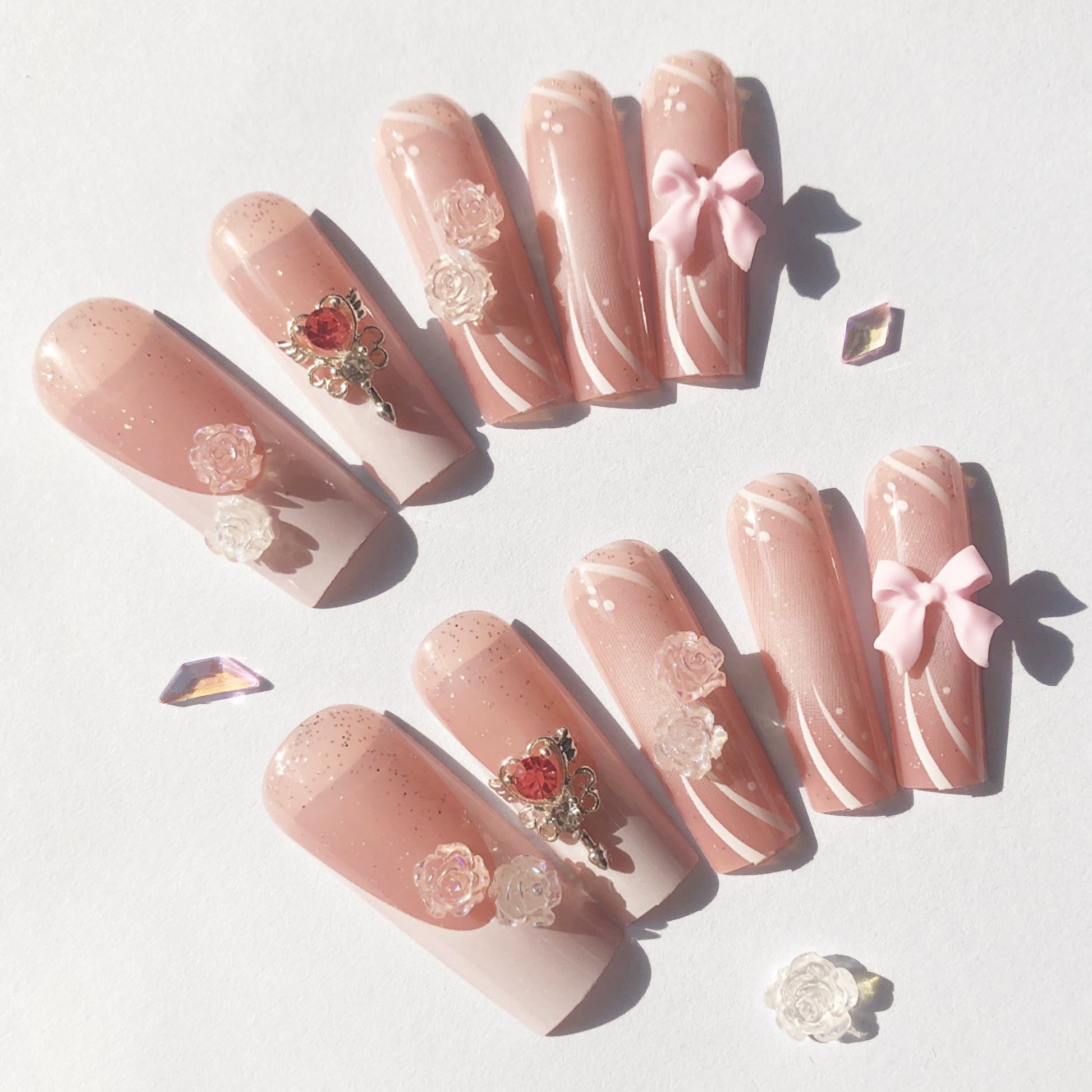 Ruby Moore The first time I saw this nail art set, I was attracted by its soft and dreamy design. The soft pink tone is like cherry blossom petals in spring, exuding a touch of romance. Delicate flower decorations, paired with shimmering iridescent elements and playful bows, make each nail like a beautiful work of art, exuding a gentle and charming aura. Wearing it, I feel like I'm in a dreamy garden, and I become gentle and charming.