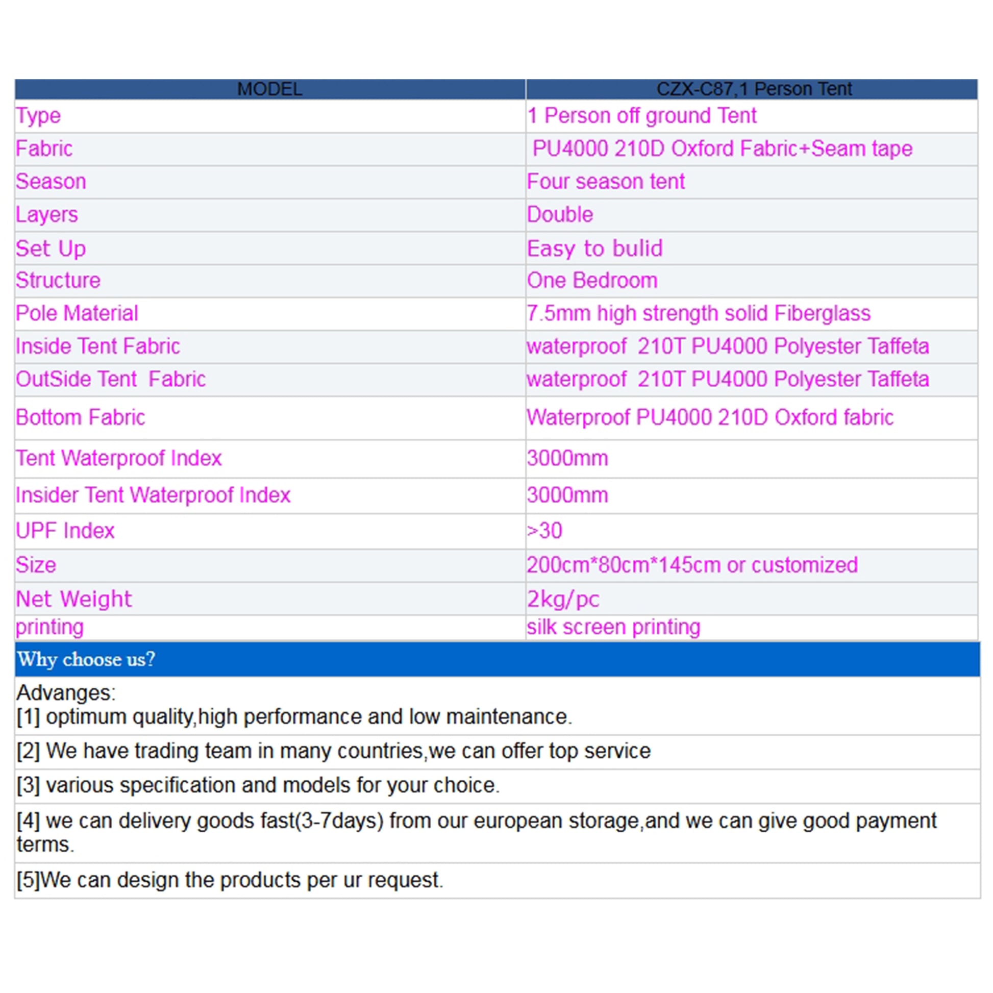 I was impressed by this elevated tent at first use! It’s lightweight and easy to carry, very convenient to take on a hike. The elevated design can effectively isolate ground moisture and small insects, which is very practical for outdoor camping. The tent has a suitable space, is easy to set up, and is very comfortable to rest in, which has greatly improved my outdoor camping experience. Worth buying!