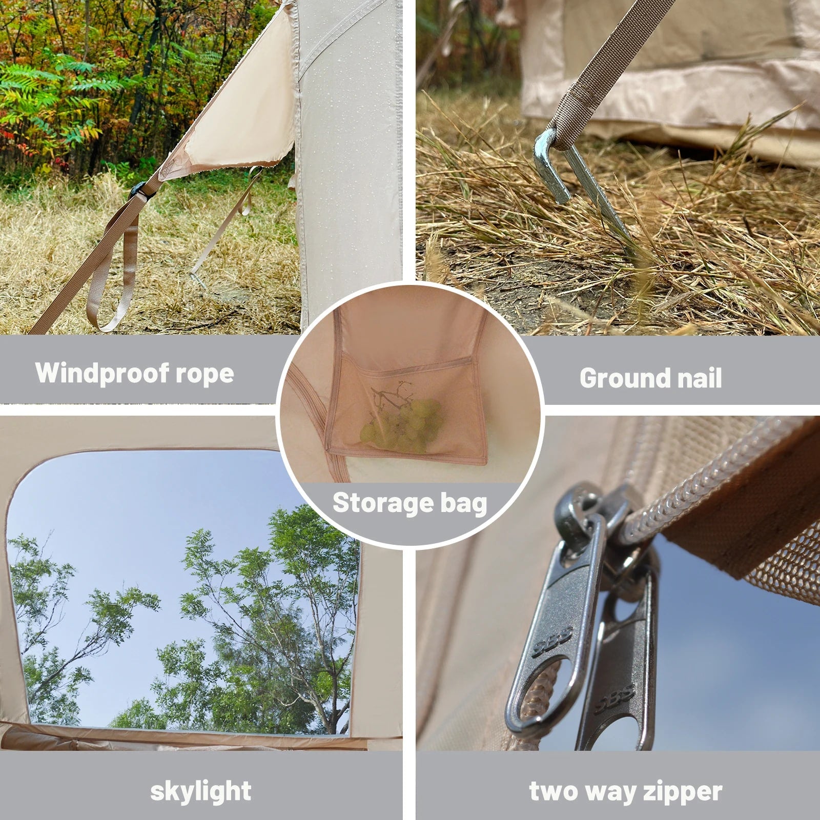 All zippers of the tent are waterproof. Even if the zippers are not fully closed on rainy days, no rain will seep in—perfect details!
