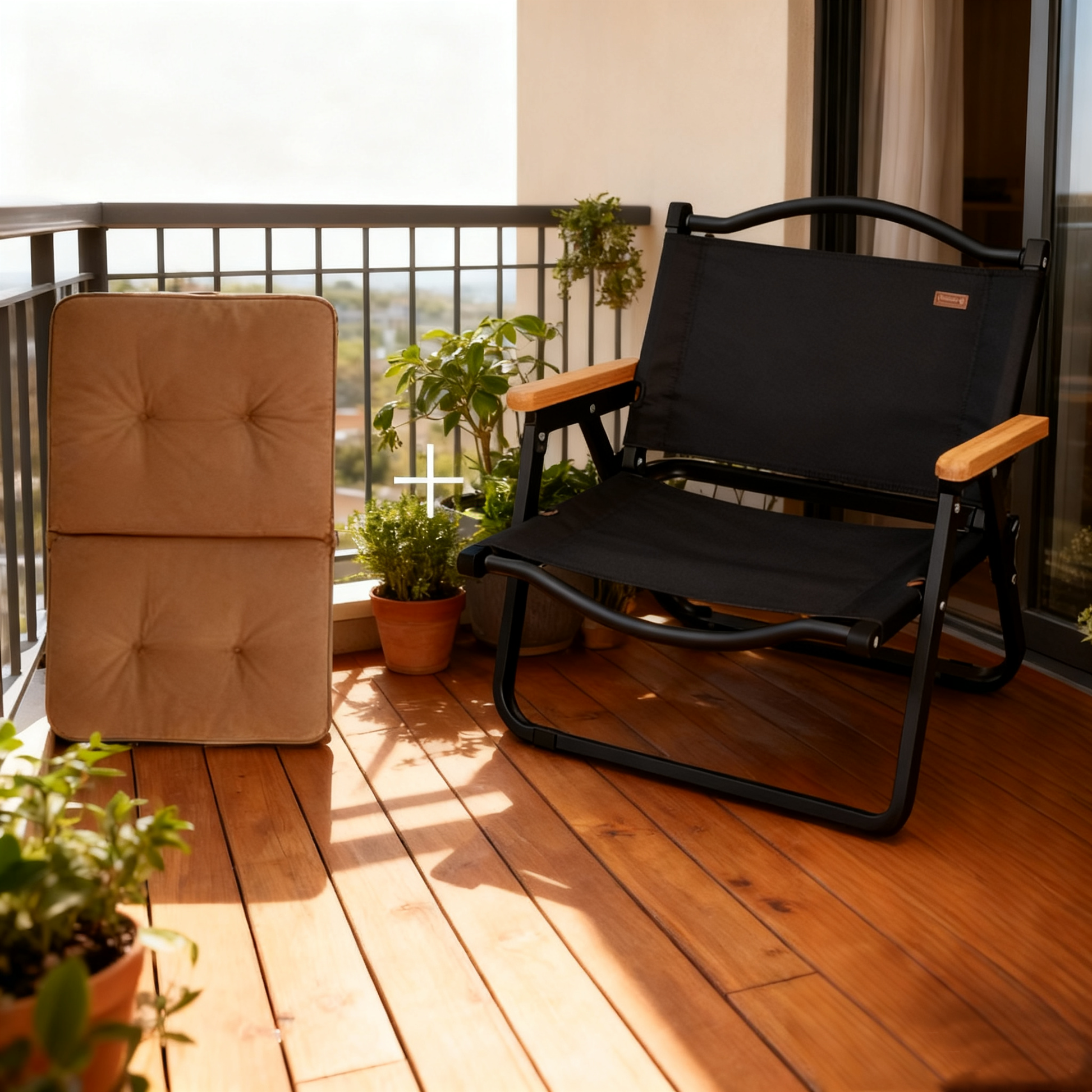 When I first saw this set, the simple black lines of the folding lounge chair paired with wooden armrests look both stylish and natural. The beige color of the seat cushion creates a soft color contrast with the chair, and the overall look is very harmonious. The foldable design of the chair is very considerate, making it convenient for storage and carrying. When not in use, it can be easily placed in a corner or put in a car.