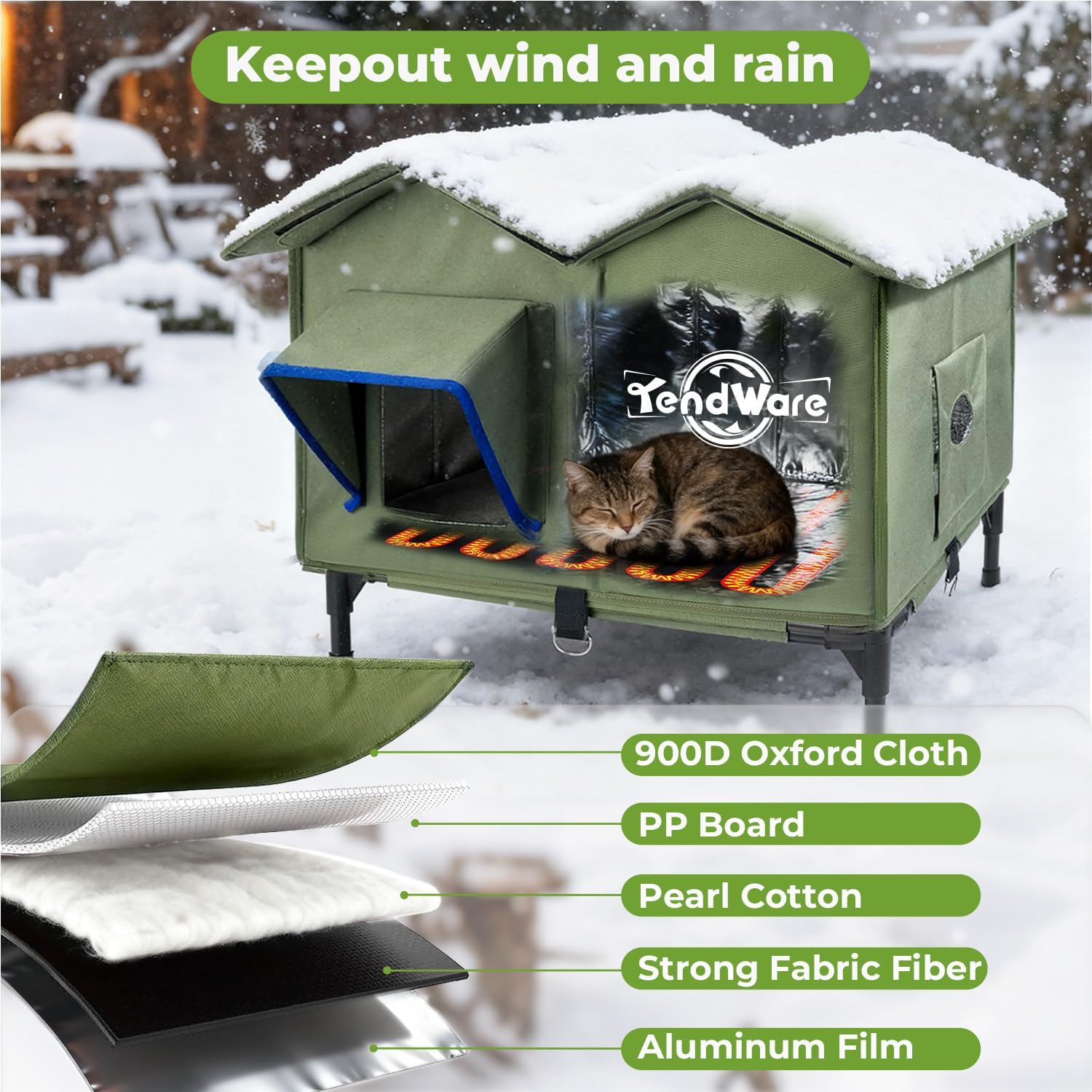 【Prevents Moisture and Keeps the Body Dry】Tendware Outdoor Cat Houses Use Waterproof Fabrics Such as 900D Oxford Cloth, PP Board, Pearl Cotton, and Aluminum Foil, Providing Warmth and Weatherproofing. Our Outdoor Heated Cat Houses Have Sewn-In Sides to Eliminate the Risk of Water Leakage. Unlike Other Cat Houses That Use Velcro Fasteners, This One Features a Raised Base to Prevent Water From Seeping Into the House. A Waterproof Power Cord Socket Also Prevents Leaks.
